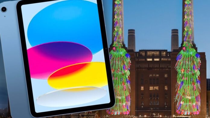In London leading up to the Christmas season, Apple’s iPad has brought a festive display to Battersea Power Station. 24 vibrant designs, selected from a competition called “Your Tree on Battersea,” are now illuminating the iconic towers of the power station.